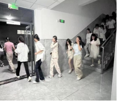 有序疏散,协同高效。当晚7时整,随着消防应急广播在宿舍楼响起,演练正式拉开帷幕。各楼层志愿者立即到位,引导同学们用湿毛巾或袖口捂住口鼻,按照预定方案,沿宿舍楼两侧楼梯快速有序撤离。疏散过程中,同学们沉着冷静,在志愿者“注意脚下、保持间距”的提醒下,有效避免了在门口、楼梯口等区域发生拥挤。待所有学生撤离后,志愿者们最后进行清查并有序撤出。也按照规划的路线有序撤离。